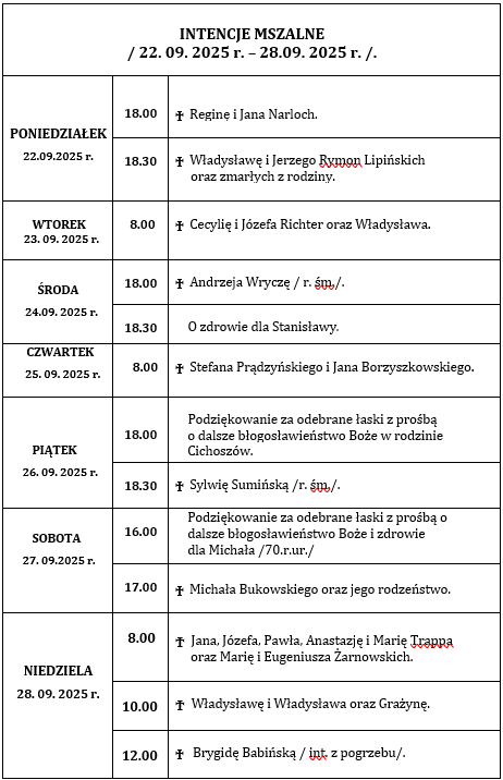 INTENCJE MSZALNE / 22. 07. 2024 r. – 28. 07. 2024 r./