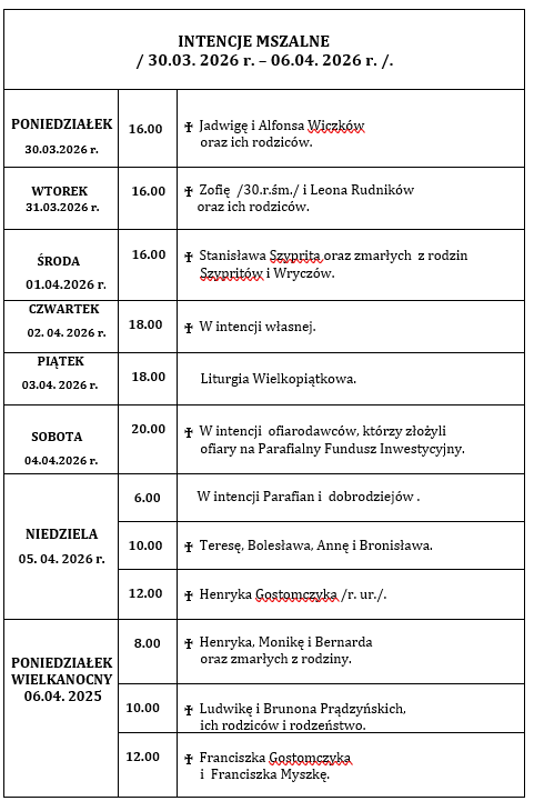 INTENCJE  MSZALNE  / 29. 07. 2024 r. – 04. 08. 2024 r./